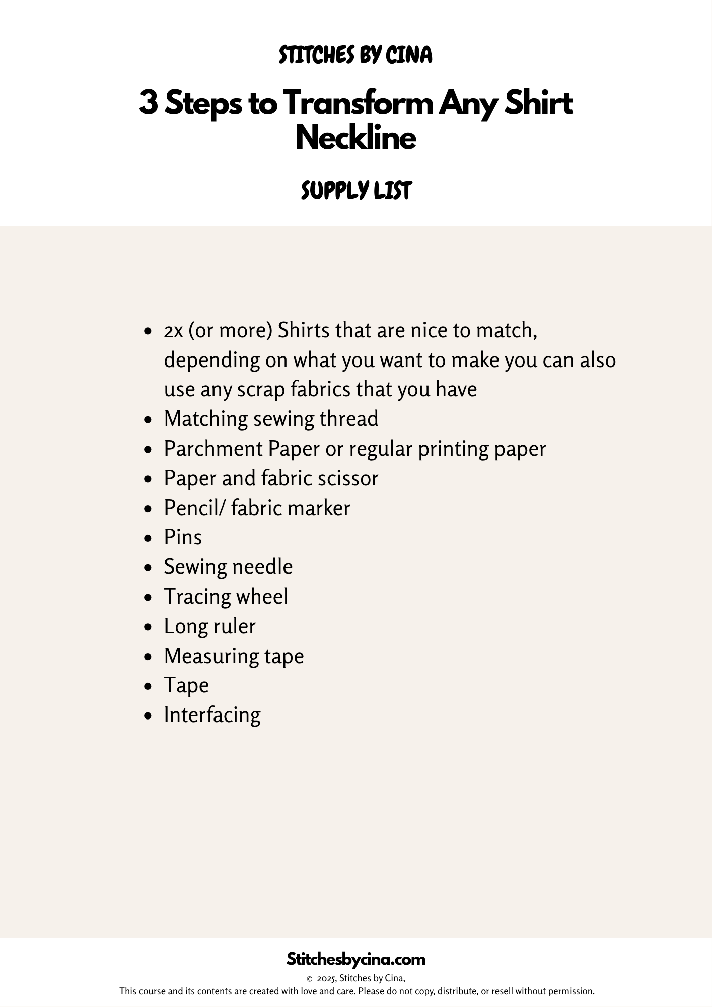 My goal with this course is to teach some really useful pattern making and sewing techniques with out needing any fancy equipment. You will need, however, a few basic supplies to get you started: