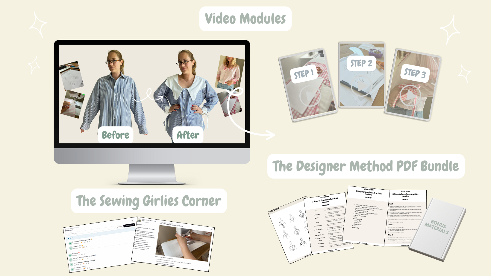 If you joing my sewing course you will also get access to additional video modules; how to create frills and ruffles, how to create cuffs, and exclusive 1:1 chat support from me (total worth 200EUR!)
